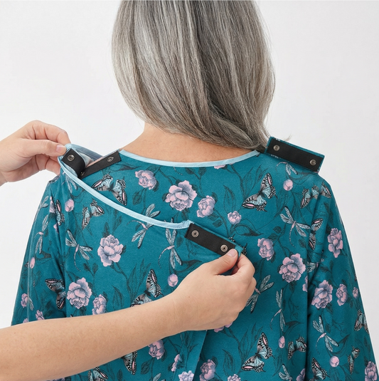 Shop nowClothes for the elderly in nursing homes are designed with functional features to help make dressing, undressing, and toileting safe and simple. Nursing home clothing makes a caregiver’s daily routine easier and safer by alleviating weight bearing tasks with adaptive features. Our adaptive nightgowns have snaps at strategic locations that help avoid pressure points, bed sores, and overlaps that provide proper coverage, palliative care clothing can also help with wound care. Silverts clothing for seniors in nursing homes provide ease and comfort.
